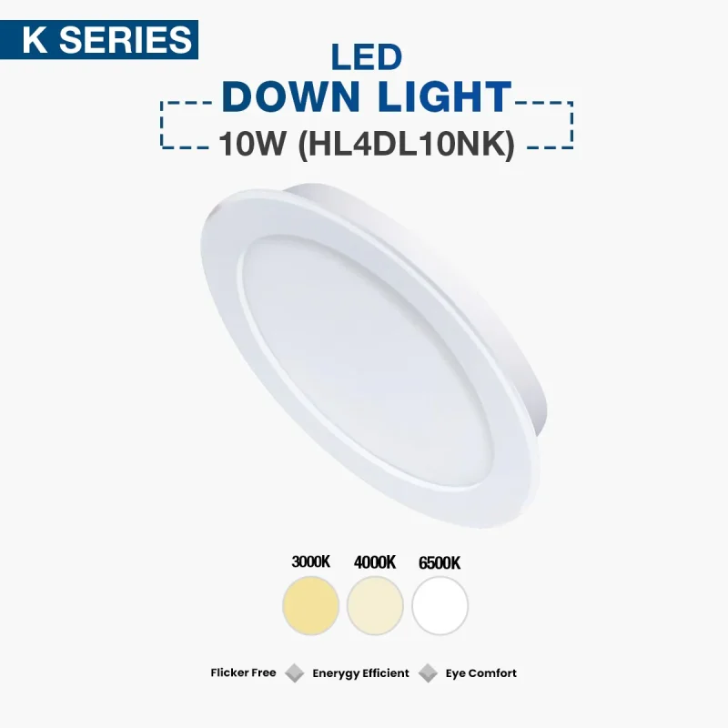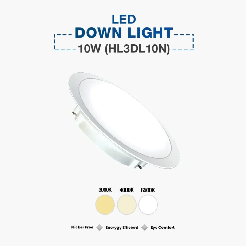 Hyundai LED Down Light 10W (HL4DL10NK) delivers bright, focused, and energy-efficient lighting with a wide 120° beam angle. Built with SMD LED technology, it offers up to 88% energy savings and lasts up to 25,000 hours. Ideal for homes, offices, halls, kitchens, display areas, and commercial spaces. Compact design, low heat emission, and 12-month Hyundai warranty.