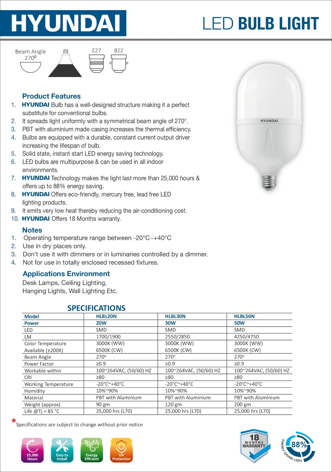 The Hyundai HLBL20N is a premium 20W LED bulb engineered to be the ultimate, drop-in replacement for outdated and inefficient conventional lighting. Built with the trusted Hyundai branding, this bulb combines advanced solid-state LED technology with robust construction to deliver exceptional performance and reliability. Its key strength lies in its remarkably wide 270-degree beam angle, which ensures a uniform and widespread distribution of light, eliminating dark spots and creating a well-lit, comfortable environment suitable for any room.