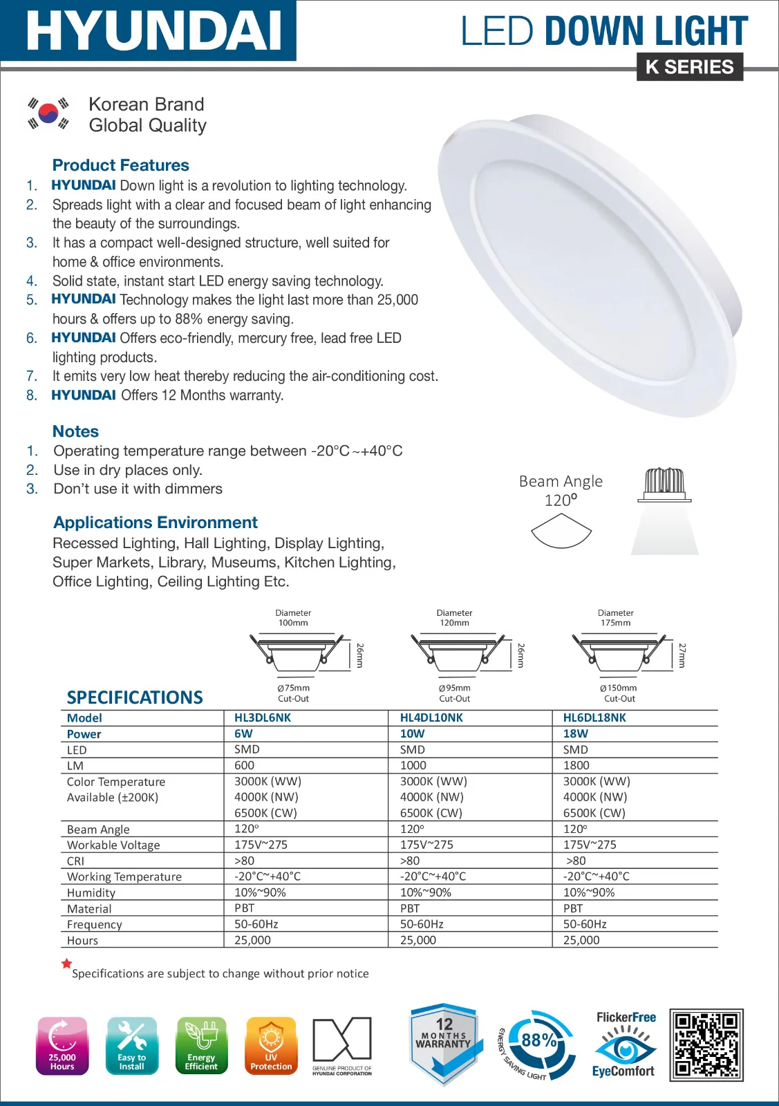 As an environmentally responsible choice, the HL6DL18NK is completely free of mercury and lead, with low heat emission that contributes to reduced cooling costs. Backed by Hyundai’s 12-month warranty and global quality assurance, this down light offers reliable performance for demanding lighting applications where consistency and quality are paramount.