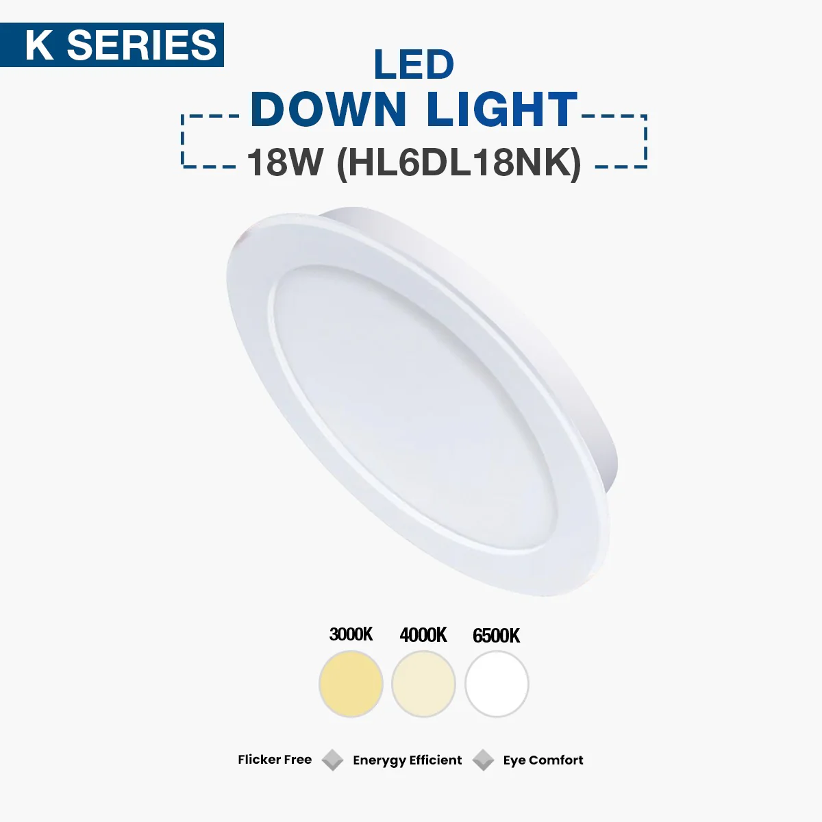 The Hyundai HL6DL18NK embodies Korean engineering excellence and global quality standards in LED down lighting technology. This high-output 18W down light utilizes advanced SMD LED technology to generate an impressive 1800 lumens of superior-quality illumination, distributed evenly across a wide 120-degree beam angle that ensures comprehensive coverage for large interior spaces. As part of Hyundai’s premium lighting series, this product combines innovative design with reliable performance for both commercial and residential applications.