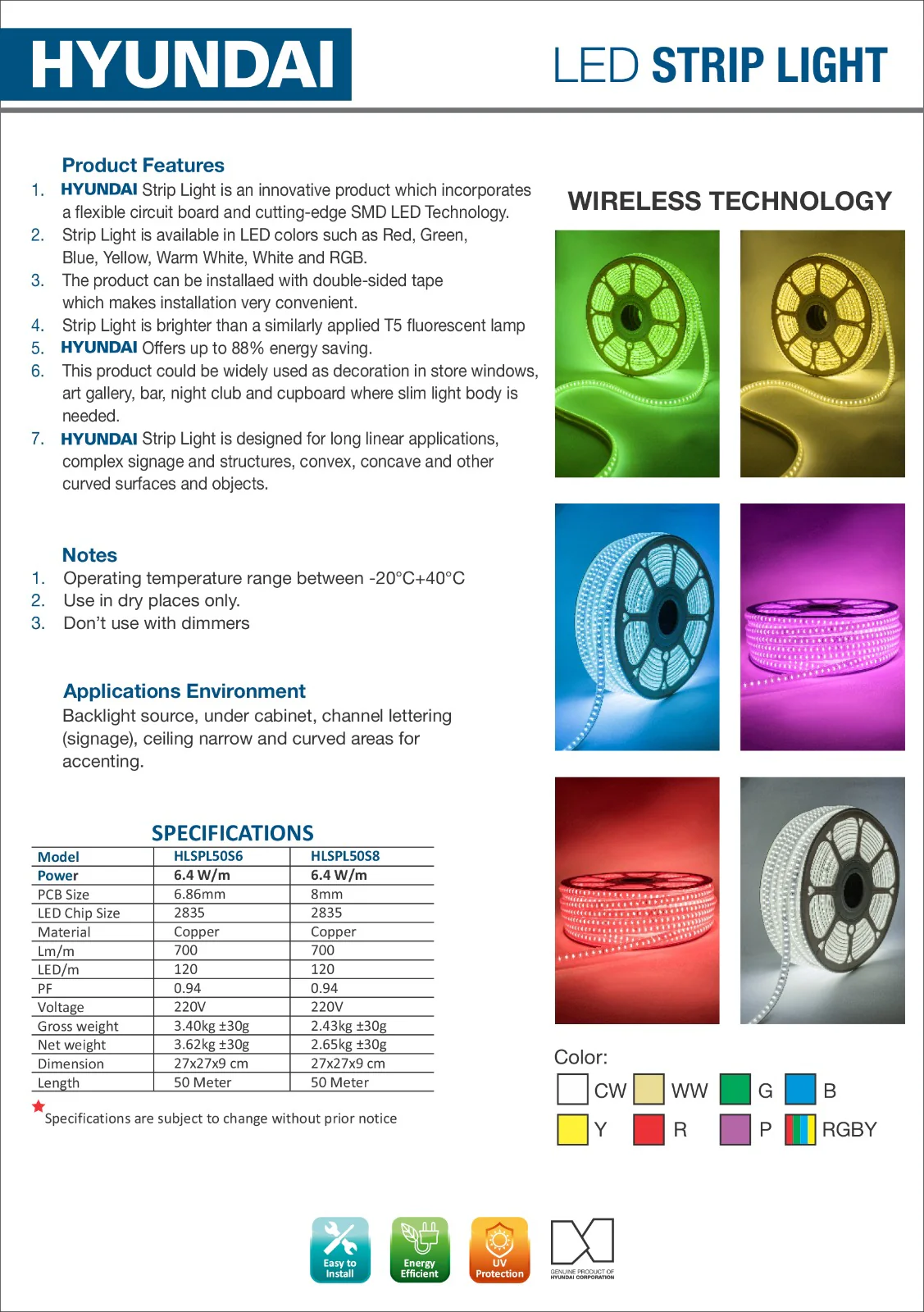 The Hyundai HLSPL50S6 is an innovative 6.86mm wide LED strip light featuring flexible circuit board technology with cutting-edge SMD 2835 LEDs. Consuming 6.4W per meter and delivering 700 lumens/meter, this ultra-slim strip light offers superior brightness compared to T5 fluorescent lamps with up to 88% energy savings. Available in multiple colors including Warm White, Cool White, Red, Green, Blue, Yellow, Pink, and RGBY, it's perfect for decorative lighting, accent illumination, and complex signage. With easy installation using double-sided tape and high 0.94 power factor, it's ideal for both residential and commercial applications.